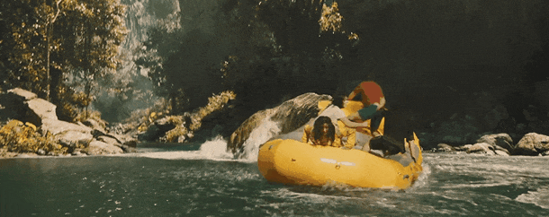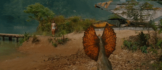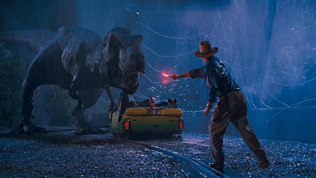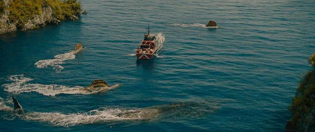 导演很“贴心”的赶紧安排一场霸王龙的追逐戏,而如果你刚好是迈克尔·克莱顿小说的读者,就会发现这场戏其实取材自《侏罗纪公园》原著小说的情节,但来源自哪不重要,这场戏完全就像是游乐设施,有水花、有尖叫、有霸王龙故意放慢速度的追逐,好笑的是,刚好就是这家人,他们经历过“双冠龙”(出来威吓一下女孩就跑走)、“迅猛龙”(出现在模糊的背景后就被新物种攻击)、“暴龙”追击(橡胶船漂漂河)。