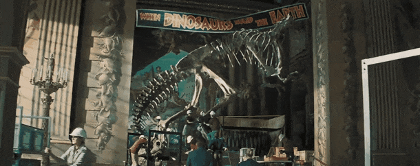 不仅如此,本片更“简单粗暴”的,就是上一部《侏罗纪世界3》也有的“经典IP致敬”,《重生》在博物馆上的布条加上霸王龙的骨骼标本(致敬《侏罗纪公园》片尾霸王龙吼叫)、泰坦巨龙在草原里出现(一样致敬《侏罗纪公园》中艾伦博士第一次看见恐龙、这片段《侏罗纪世界2》也致敬过)、在实验中心躲避变种恐龙的追杀(几个运镜方式、角度完全致敬《侏罗纪公园》厨房迅猛龙场景)……